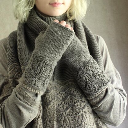 A lovely and leafy lace cuff is set off by a smooth stockinette hand and a pretty, contrasting-color underlayer peeking out from beneath. Thumb shaping is part welt, part flap for a perfect fit. Wear them solo or with [Verduri scarf or shawl][1].