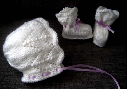 - A gorgeous traditional style bonnet and matching booties set featuring the pretty (yet easy to knit) Veronique Lace pattern.