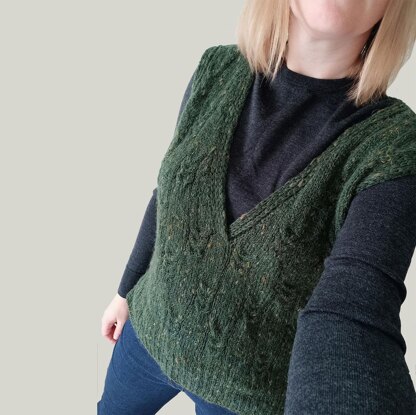 Cabled vest, V-nesk, flat knitting, without shoulder seams, positive ease.