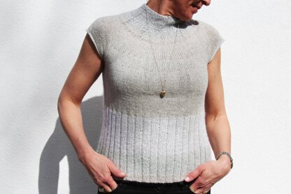 Vesterbycrea No.03 is a stylish turtleneck with a tight fit. The model is knit from top to bottom. At the beginning of the garter, knit the neckline and then shoulder slit. The garter is knit around first in both rib pattern and plain knit with dec. Body is also knit in rib pattern and ends with elastic closure. Sleeve edges are picked up in the existing stitches and knitted around the rib before ending with elastic closure. The turtleneck is therefore assembly-free.