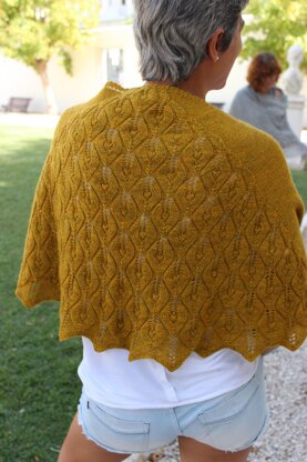 Vice-Versa is a semi-circular shawl built from the center to the border, featuring a central leaf panel framed in stockinette stitch.