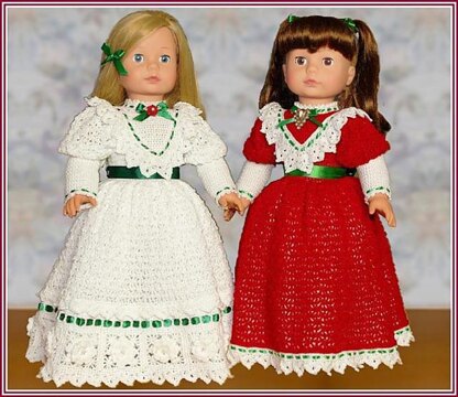 "Victorian Elegance" features two pretty outfits based on antique gowns, sized to fit an 18" stuffed-body little girl doll. Pictured are Rose Ellen, aka Nellie (left), and Mary May (right), named after two of my great-grandmothers. All outfits are crocheted in Size 10 crochet cotton, with great attention to detail, including ribbon and bead trims, fancy buttons up the back, and matching antique-inspired jewelry. The pattern for a Long Petticoat/underskirt is also included.