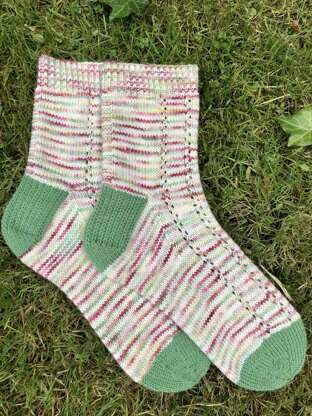 The yarn I used for the pattern sample is by Sherry Iris Designs in the 'Wild Strawberries' colourway. The heels and toes were knit using Cascade Heritage in 'Herb'.