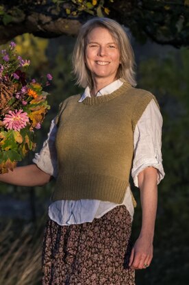 Vilma is worked in Stockinette stitches and a k1 p2 rib. Neckband is folded double.