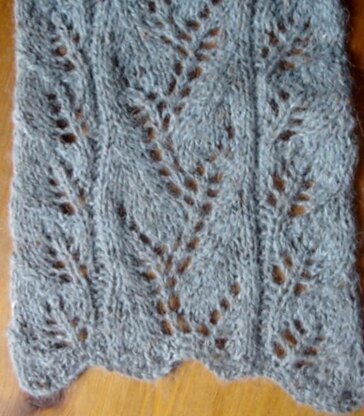 Lacy scarf featuring a central Vine Lace panel with a Leaf panel at each side and scalloped ends.