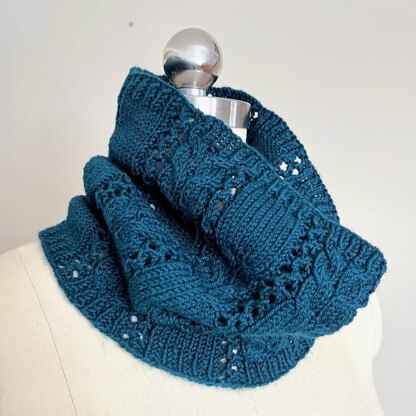 A simple, but dramatic, pairing of cables and lace creates a cozy cowl. A relaxing project, this cowl is perfect for that one skein of luxury yarn or as a gift for someone special.