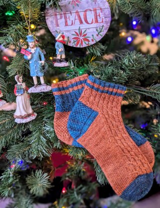 This sock pattern utilizes cable stitches to create a honeycomb pattern reminiscent of classic paper Christmas decorations.