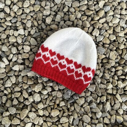 Vinya is a beanie style hat featuring cute little hearts. Simple to knit this hat would make a great first stranded colourwork project.
