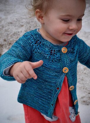 A sweet little top-down, round-yoke, baby and toddler cardigan. Shown in size 2 yrs.