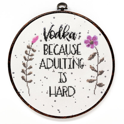 Ah yes, vodka. Whether you enjoy drinking vodka or not, the Vodka cross stitch pattern reminds you that we all have those days. We can all relate to the feeling of wanting something to help us get through that oh-so-boring mandatory meeting at work, or the pain of your kid's school Christmas concert when you just want to remove your ears from your body... This pattern also has a substitution for the word vodka (in case wine is more your style). Adulting is hard, but you don't need to let it drive you to drink if you can unwind by stabbing the simple Vodka cross stitch pattern instead. The pattern includes a full colour pattern, full b&w version, as well as a one-page pattern for mobile devices. Model stitched over two on Zweigart 32ct Murano Lugana (Light Basalt Splash).