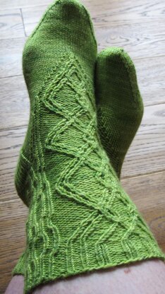A top-down sock with traditional heel flap and rounded toe, decorated with delicate interwoven cables in a repeating pattern. There are three sizes available, with modular size panels accommodating these. The sample is shown in the medium size, and uses Forbidden Woolery Gluttony Sock in the ‘Springtime in Paris’ colour way. The pattern is both written and charted – see Quick Reference for page numbers for the appropriate version.