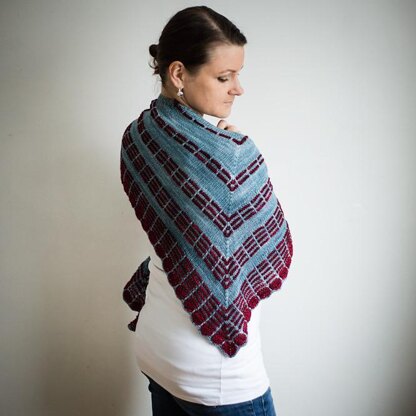 This slightly crescent shaped top-down triangular shawl is made from soft and light merino yarn with lots of Stockinette and some garter with little drop stitch details. You will work with only one color in a row. This is a fun colorwork pattern and suitable also for beginner knitters.