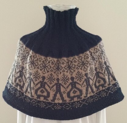 Starting at the neck, you’ll work in the round with the main color, creating a loose, ribbed turtle-neck that extends to the shoulders. You’ll then begin the colorwork chart in CC1 and CC2, finishing the bottom with the MC and CC1 in a simple, contrasting colorwork pattern. The hem of this fun poncho is done in a broken rib stitch. The poncho, in this one-size pattern, is approx 12 inches from the shoulders to hem (hitting just above the elbow), with the ribbed collar approx 7 inches tall (may be folded down or worn up as shown in the picture). The poncho as shown here is approx 50 inches around.