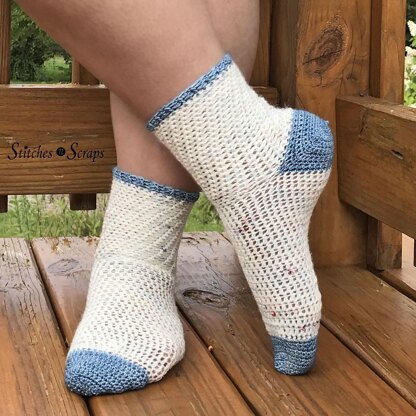 Treat your feet to these super soft, cushy, socks! This crochet socks pattern is great for first time sock crocheters because it has a simple construction that works up quickly. With a stretchy cuff, squishy yarn, and roomy fit, you'll feel like you're walking on clouds.