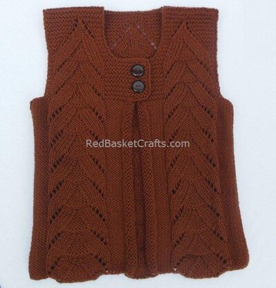 A light touch to your mid-seasonal wardrobe: a two-button vest knitted from the bottom up in a leaf stitch. Recommended yarn: 1) Worsted yarn (110yds/100m, 1.75oz/50g per skein): 6 [7, 8, 9, 10] skeins for sizes S [M, L, XL, 2X] respectively, or 2) Worsted yarn (220yds/200m, 3.5oz/100g per ball): 3 [4, 4, 5, 5] balls for sizes S [M, L, XL, 2X] respectively.
