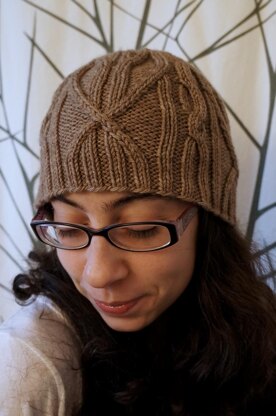 Knit from the bottom up using worsted weight yarn. Cables "wander" from the cast on to crown.