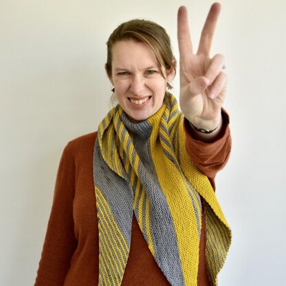 The War and Peace shawl uses fairly mindless knitting and contrasting skeins to result in bold color play. Varying solid and stripey sections change just often enough to hold interest, yet the “garter on cruise control” makes for a relaxing project. The dramatic V-shape sits easily on shoulders so the shawl can function as a statement piece without a lot of styling fuss. Because of the shawl’s clean lines, any yarn dye technique is fair game, even gradients. Or knit in your favorite team colors! Easily adaptable to any yardage – just knit to the halfway point as weighed on a gram scale, then work the second half.