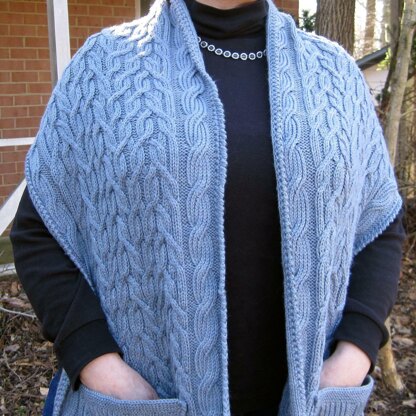 This warm pocket shawl pattern is designed using two very unusual cable stitches: a highly textured overlapping cable, and a 7-stitch twisted cable. If you enjoy cabling, you’ll enjoy making this shawl.