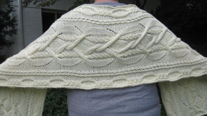 This warm stole, knit with worsted weight yarn, will not only cheer you up on drab days, but will also keep you warm. The stole features 2 distinct cables. The focal cable is an unusual one, fairly delicate and yet ornate.