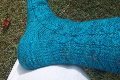 This pattern combines simple cable and lace patterns in an attempt to capture the ebb and flow of waves crashing against a beach. While any medium weight sock yarn will work, solid or semi-solid yarns in “water” colors are suggested to accentuate the wave pattern. Directions for a fitted heel and simple arch shaping are also provided. Smaller and larger sizes may be obtained by using smaller or larger needles and adjusting the length of the foot accordingly. Requires intermediate knitting skills and the ability to read charted patterns.