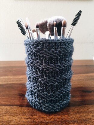 The Chevron coffee cozy should work for many different objects, even though they were designed especially for coffee cups. Try it on a can, on a little vase, or a simple glass and have fun knitting! The Chevron coffee cozy is knitted in the round from bottom up. The main body is worked in a Chevron pattern for textural and visual interest. In the end, the bind off is worked with the i-cord method. You need to know how to knit, purl, basic increase, and decrease.