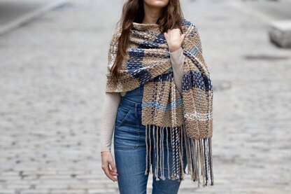 The Waterbury Plaid Blanket Scarf transforms basic stripes into dramatic plaid with a simple weaving technique. This elegant wrap requires only beginner level skills and can be worked up in any color combo to create a beautiful, special fabric. Wear it draped over your shoulders, wrapped like a shawl, or bundled like a scarf for three different looks!