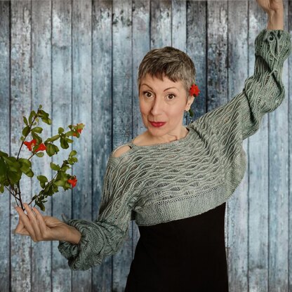 This kind of easy shrug is worked from side to side with no increases or decreases, creating large, dramatic sleeves. With the simple addition of drawstrings at the wrists, with i-cord to close them, it’s possible to choose how to wear the shrug: with the usual sleeves or with balloon sleeves. The piece is worked mainly in the round with a nice wavy open “lace” made with the simplest slipped stitches. Waves of Lightness is a very versatile piece and can be used over jeans as well as with an elegant dress.