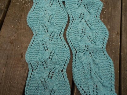 Knit this beautiful lacy fern scarf with its delicate lace stitch featuring a bobble here and there, and its fun to work wavy edges. The pattern is easy to work, and is quite addicting—you just don’t want to put it down until you are finished with it! Make it shorter to wrap once around your neck or longer to wrap twice. It is a lovely addition to your lace wardrobe.