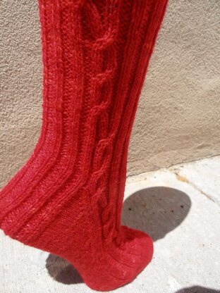 A ribbed sock with 2 wayfaring cables, one on the back and one on the front. The front cable continues down the foot while the back cable meanders down the heel flap.