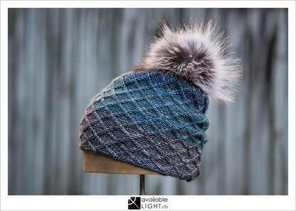 Exploring patterns and textures, this beanie was inspired by simple square wire mesh. The fine straight cables weave under and over each other as they wrap around the fabric. The pattern quickly becomes intuitive which makes it a fast knit.