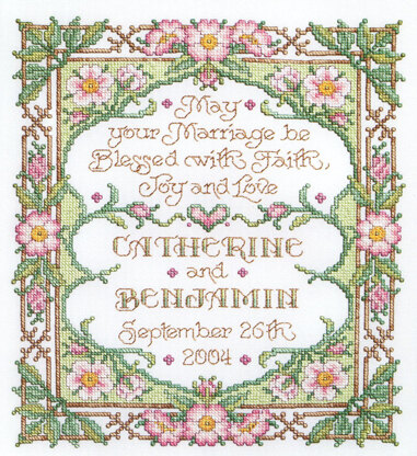Designed by: Sandy Orton. Honor the vows a couple make to each other on their wedding day with a simple floral sampler. The happy couple will be delighted to receive such a lovely reminder of their love.\n