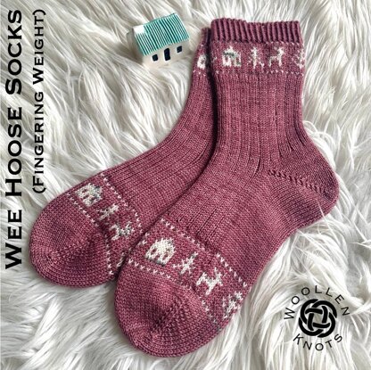 The Wee Hoose Socks are knit from the toe up in rib with the option of placing the “Wee Hoose” colourwork either after the toe increases or around the top of the leg before the cuff, or both.