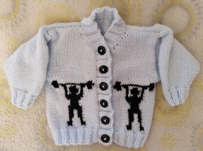 My friends are weight lifters so I knew exactly what I wanted to add as a motif to the cardigan I made for their baby. This little strong baby adds the perfect touch to this snuggly warm cardigan, perfect as an extra layer.