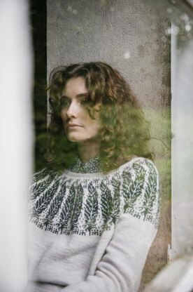 Weightless sweater is worked top-down seamlessly. The sweater has a round yoke with a delicate feather pattern. The sweater has long sleeves and the body is boxy with no waist shaping. The neckline, cuffs and hem are finished off with garter stitch.