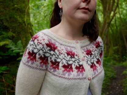 Featuring a fitted, patterned yoke and flared sleeves, this long, flowing cardigan is worked from the top down and flares out over the hips. The cardigan is worked in the round and then steeked.