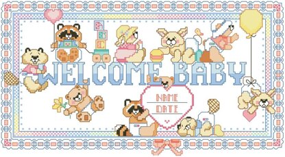 Designed by: Linda Gillum. Beavers and bears and raccoons, oh my! Sweet baby animals adorn this "Welcome Baby" sign perfectly suited to celebrate a little one's arrival. Personalize for an adorable gift for any new mom to brighten a nursery.