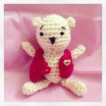 Wentworth is a cute amigurumi teddy bear, with a customisable sewn face and removable jacket. The limbs are designed to enable him to sit (unaided) or stand (propped up), as they are drawn up to posable points before being sewn on.