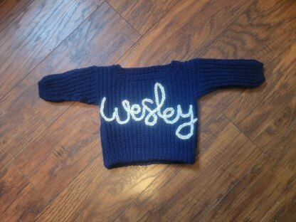 The Wes Baby Sweater is a simple drop shoulder baby sweater knit in False Fisherman's Rib with optional name embroidery. The body is knit flat in separate pieces from the bottom up. After seaming these together, stitches are picked up for the sleeves and collar to be worked in the round. The bottom hem is folded. Scrap yarn can be used for the chain stitch embroidery.
