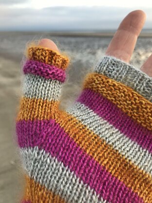 West Sands Mitt is knitted top down in stripes – why not use remnants? Seven-row stripes in three colours is one way to go, but feel free to make your own stripes or other colour work.