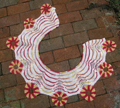 Wheels is a crescent-shaped shawl that features a high-contrast colorway in wheels and stripes against a neutral background. The wheels are worked flat, using short-rows to create the curve. The body is also worked flat, bottom up, from a combination of stitches picked up from the wheels and newly cast-on stitches.