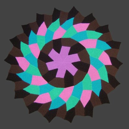 The afghan shown in the first photo consists of 90 identical pieces which are stitched together. The stitching is very easy because they are all in garter stitch and the edges are easy to match together. The afghan will lie flat without any blocking.