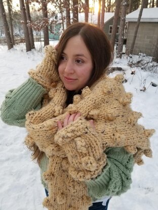 This one-of-a-kind oversized bobble scarf will be an heirloom for years to come. It is knit with super bulky yarn on large needles, making it a quick project. A whimsical, fun way to keep you warm this winter ~ and the next! Easy fingerless gloves are included with the pattern.