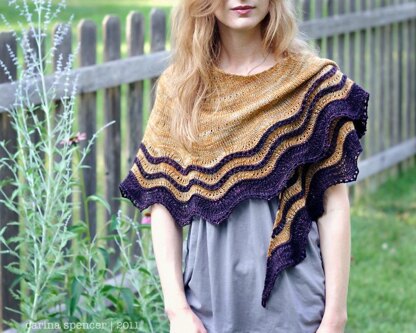 Whippoorwill is a modest, yet elegant shawl whose contrasting lines of eyelets dance along its border like the unique song of the bird whose call lilts through the air of the midwestern woodland where I was raised. Its range of sizes, crescent shape, and wide wingspan allow for several different styles of wear.