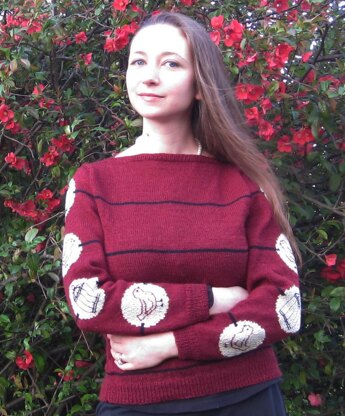Lightweight wool boatneck with intarsia and embroidery sleeve detail. Inspired by Victorian thaumatropes, the black "string" stripes wrap around your body, and the bird and cage embroidered circles parade up the sleeves.