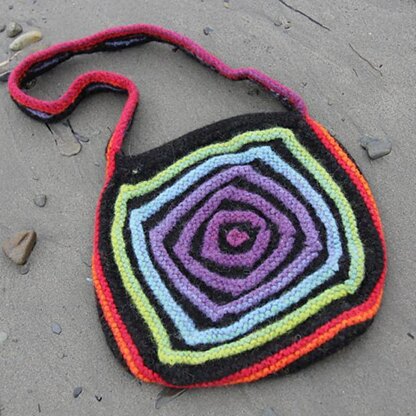 These tipsy striped squares are created by the directional biasing of the lines of decreases. Each section of the bag is knit onto a previous piece and the whole requires only minimal finishing. Limitless variations are possible.