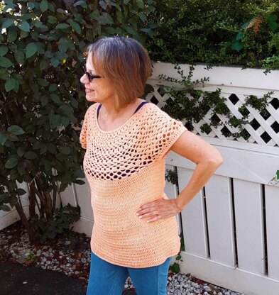 The White Peach Round Yoke Tunic is worked in the round from the top down. The fit is relaxed. The body consists of delicate double crochets with a contrasting openwork yoke. The recommended yarn is a lightweight DK cotton. Pop it on over a tank top or long sleeve top. The pattern includes 6 sizes, as well as schematics. Sizes: XS, S, M, L, XL, 2XL. Skill Level: Easy. Crochet Hook: G