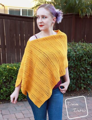 Please note this pattern is free to view on DivineDebris . com Don’t let the simplicity of this design fool you, it’s a fun pattern that will become one of your favorite new accessories. This asymmetrical poncho (which you could change to a shawl if you wanted, is a very easy to make and understand pattern that is classic in appearance. And it comes in 4 sizes SM/MD, LG/1X, 2X/3X, 4X/5X so you can find what works bet for you.