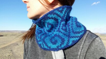 Whorl is a doubleknit cowl featuring swirls and diamonds. Worked in doubleknit technique, the cowl has a double-faced fabric, ensuring it is warm and cozy. Pattern includes extra notes on doubleknitting for those new to the technique.