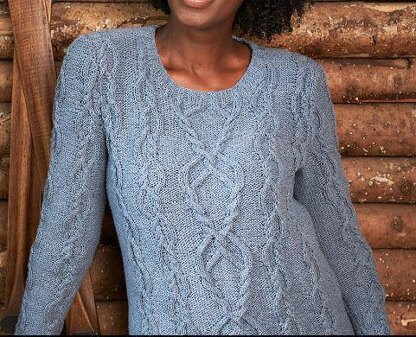 This is a pattern for a wide twist cable jumper, originally published in The Knitter. It has a, interesting wide looped cable at the centre with swinging cables beside it. Photo The Knitter.