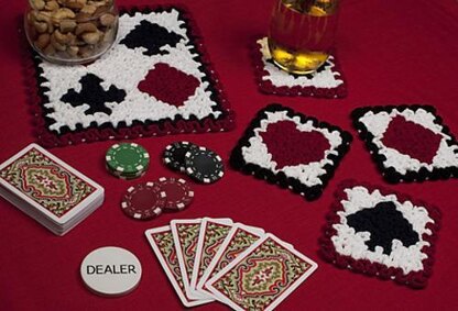 Wiggly crochet is a fun technique that is easy to learn. Perfect for decorating, these coasters and centerpiece will add a little “pizzazz” to your next Pinochle, Bridge or other card playing get together! The centerpiece is perfect for a hot dish, snack or appetizer, while the coasters keep surfaces unharmed from water rings. And they make great gifts, too!
